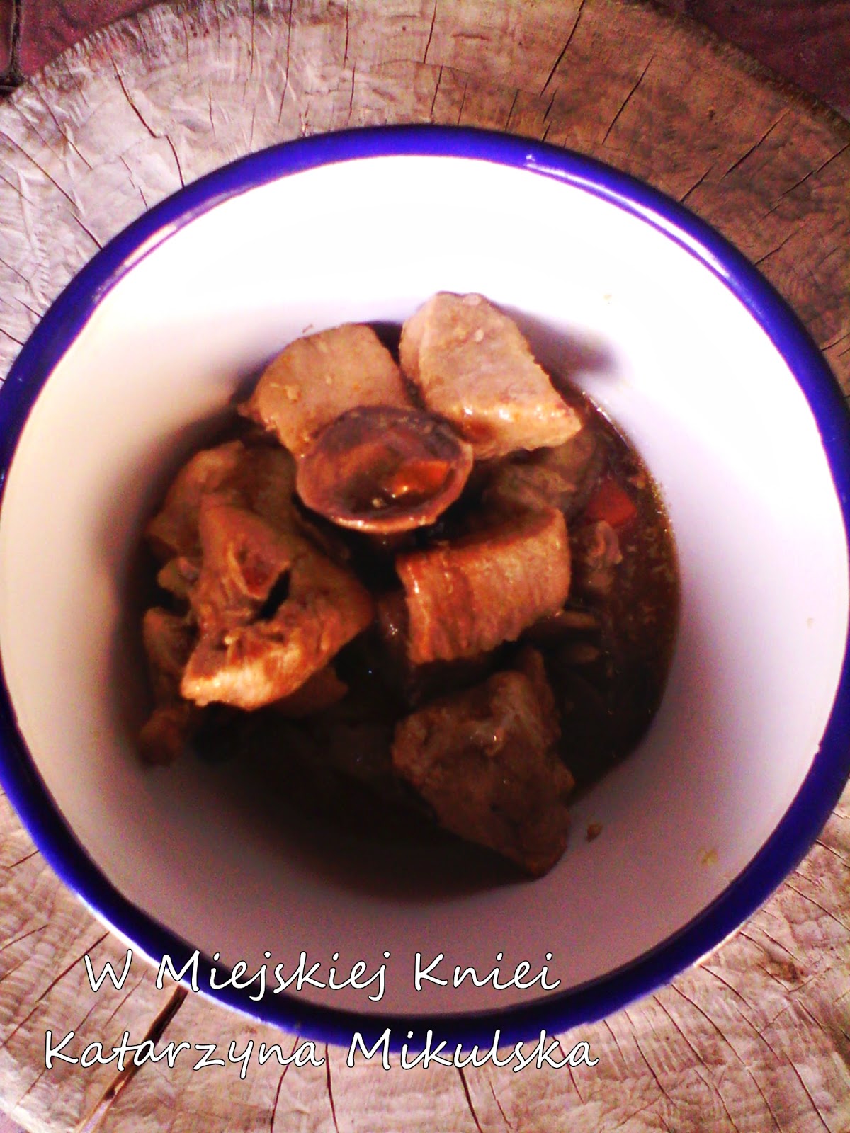 Ale najbardziej smakuje mi gulasz grzybowy. Mięso duszę (sarnina, wieprzowina) pod przykryciem w menażce na żarze. Chodzi o to by z mięsa wytopiły się soki. Lekko podlewam wodą jeżeli mięso jest chude. Jak mięso lekko nam się poddusi dorzucamy do niego 6 ziaren szyszkojagód jałowca, 6 korzeni dzikiej marchewki a jak gdzieś w plecaku macie cebulę to śmiało dodajcie.